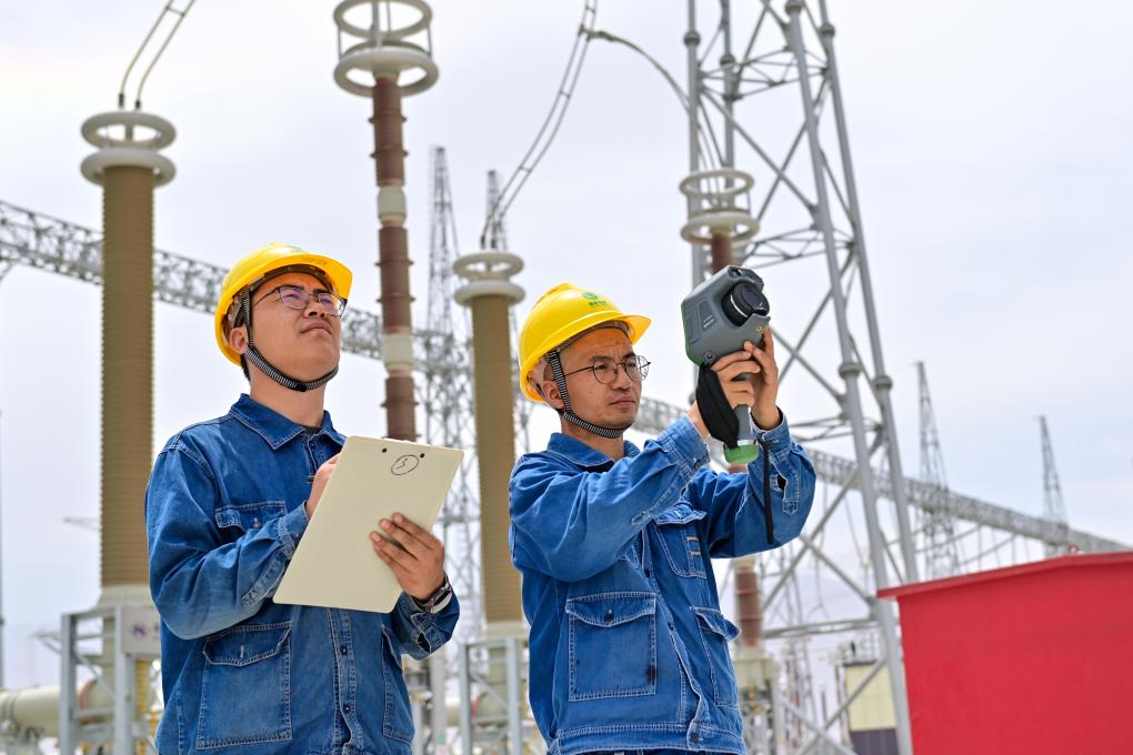 正在新疆环塔里木盆天750千服输变电工程若羌750千伏变电站,运检职员检测建立暖度(6月27日摄)。新华社记者丁磊摄